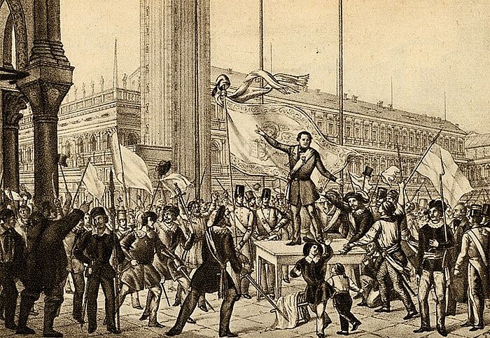 Portée par le printemps des peuples qui embrase l’Europe entière en 1848, l’Italie connaît un grand mouvement insurrectionnel que son historiographie nationale nommera plus tard la « Première Guerre d’indépendance ». Dans le Royaume de Lombardie-Vénétie, les villes de Milan et de Venise se révoltent et chassent les Autrichiens au mois de mars 1848. À Venise, Daniele Manin proclame la république et la ville s’engage dans une longue résistance contre l’armée de Radetzsky qui dure jusqu’en août 1849. Mais en vérité, s’agit-il de restaurer la Sérénissime République, ou d’œuvrer à la construction de l’Italie ?